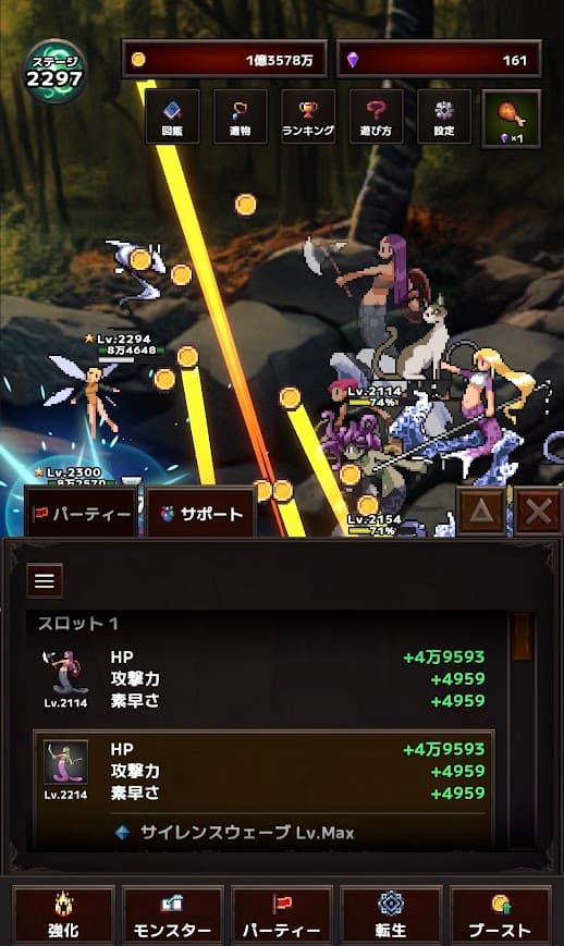 東方異変クリッカーはコインで仲間を召喚するスタイルですが、転生モンスタークリッカーはダイヤを使って敵のモンスターを仲間にして育てていくゲームです。