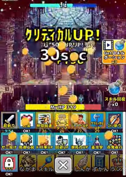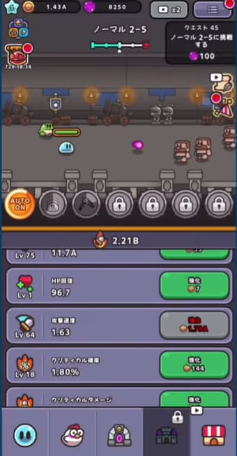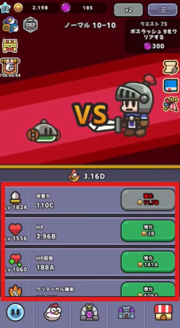 敵を倒して得られるゴールドを使って、画面下にある「攻撃力」や「HP」、「クリティカル確率」などのレベルをリアルタイムで上げて強化していきます。