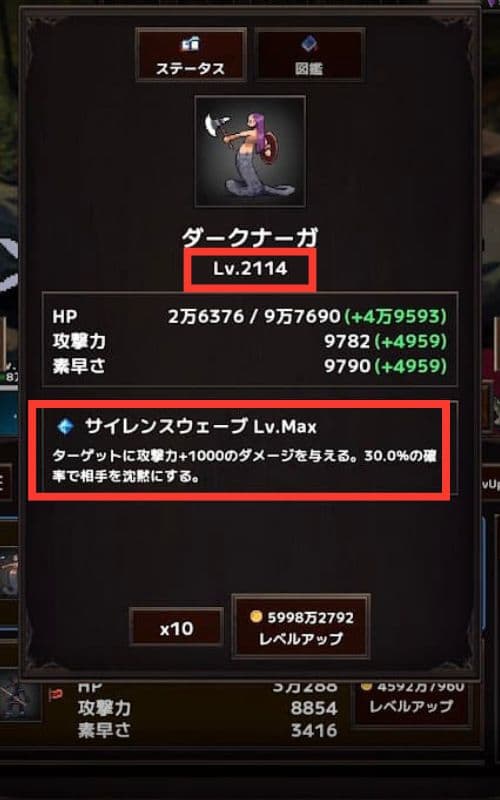 ダークナーガは頻繁に出てくる&スキルが好きなので、捕まえまくってスキルレベルをカンストさせましたw