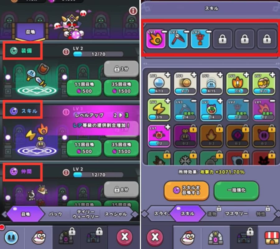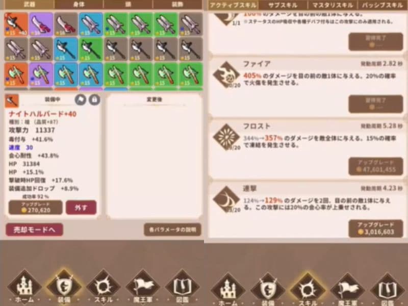 装備画面とスキル強化画面