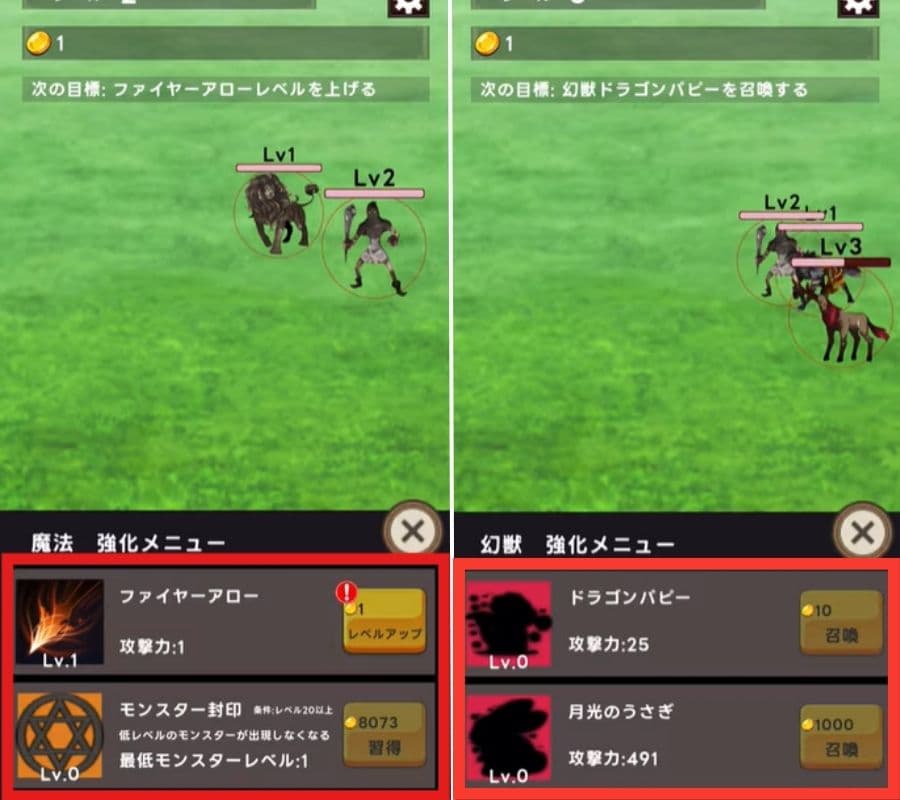 また、コインを使ってスキルレベルをUPさせたり、味方の幻獣を召喚したりしていきます。