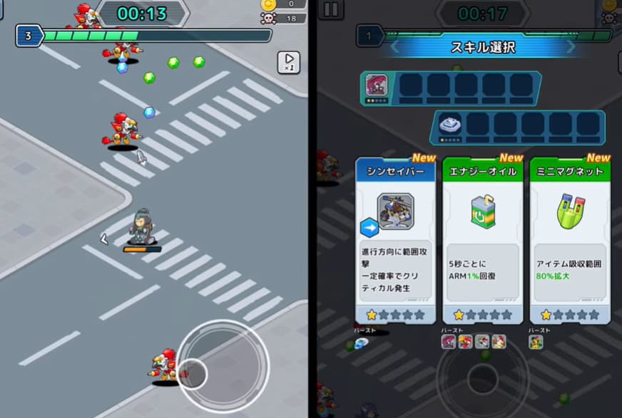 個人的に「一番ネンサバっぽい!」と感じたのはメダロットサバイバーかな!敵の大群を倒しながらスキルを選んで強化していく流れはもちろん、ネンサバを遊んでいる感覚に近い爽快バトルが楽しめたよ!メダロットやパーツの育成要素もあって、やり込みもなかなか楽しい♪