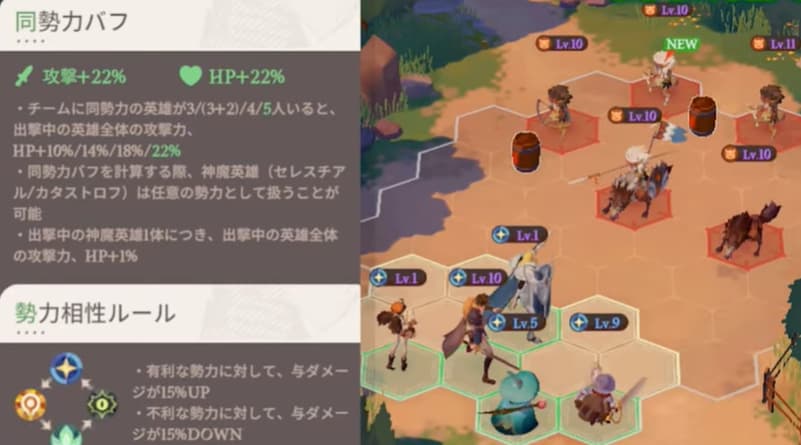 ちなみに、英雄はそれぞれ4つの勢力に分かれていて、同じ勢力で揃えるとバフ効果が最大化されるよ!だから私は、できるだけ勢力を統一するようにしてる♪