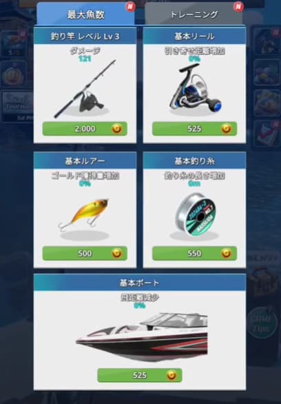 稼いだコインで釣り竿やボートを強化していくシンプルな流れです。