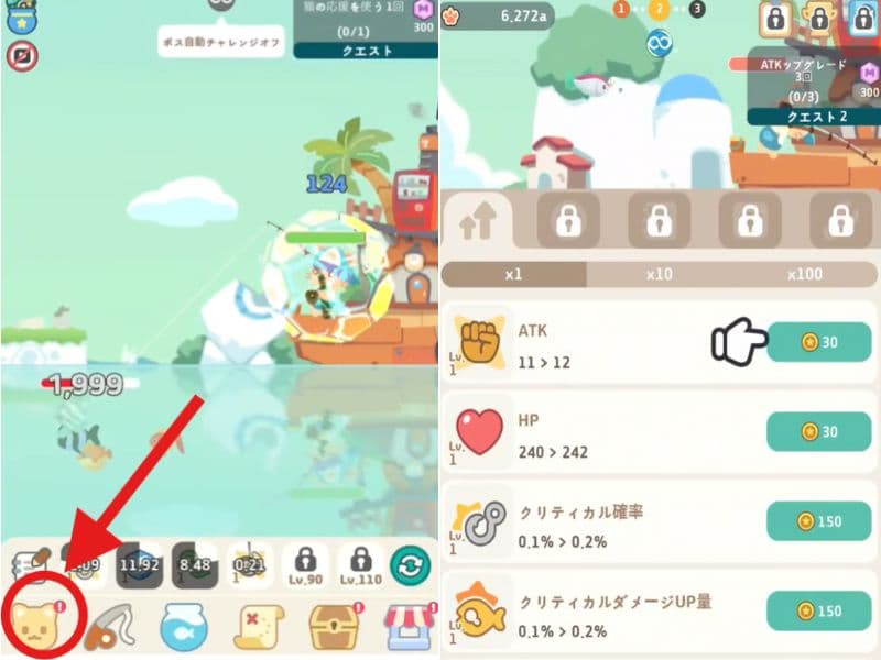 魚は何もしなくても勝手に釣り続けてくれるので、プレイヤーは左下の赤丸アイコンをタップして、どんどんステータス強化をしていきます。